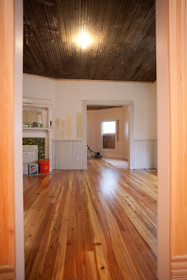 The upstairs (and stairs) received the first coat of poly! The original floors look so amazing--so warm and rich in tone! I wish the floors downstairs could have been preserved but there was hardly any left and it was patchy! Nonetheless, the new reclaimed floors look nice and will darken naturally over the years to look more like the original floors.